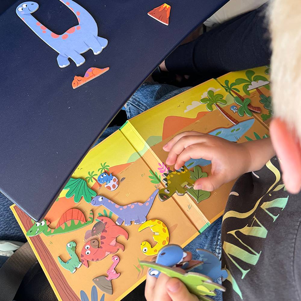 Something to keep his attention at the dinner table and on a flight is crucial for us! Colouring and stickers are holiday staples for our toy bag, but this year we elevated it with the OMY Painting pages. I loved being able to offer him some painting to work on but without the stress of the mess. We have used (and loved) the Magneti books for travel before but needed something more portable this year. Having the smaller storyboard version worked so well for in-flight entertainment. Something else we found worked well for concentration, and calm was a seek-and-find picture book and a sewing/threading game something like the ‘Peg Book’ is great as it is easy to pack and there’s plenty of projects to complete.