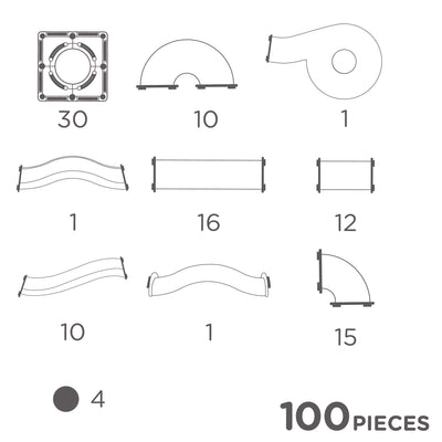 2 waves, 16 long straight tubes, 15 corners, 10 waves, 12 short straight tubes, 10 U-tubes, 30 open squares, 4 balls, 1 bowl.