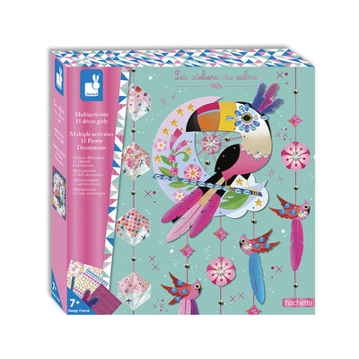 It includes everything you need as far as pretty decorations are concerned, to have fun: 3 scratch-off masks, ideal for developing fine motor skills, a dream catcher and 1 origami diamond garland to decorate your room and 6 colourful pictures to embellish with mosaics or glitter.