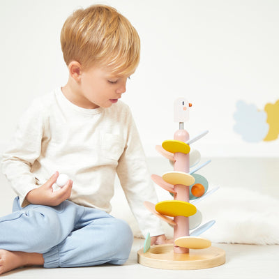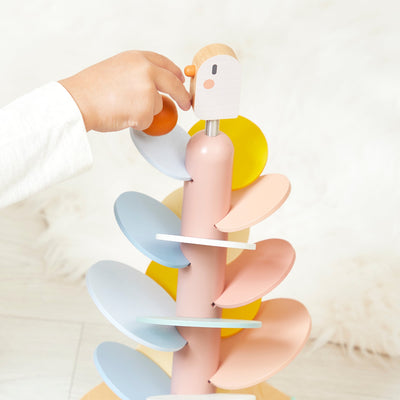 This playful toy is perfect for kids 3 and up and offers a fun and educational experience, promoting development! The whimsical bird descender helps develop fine motor skills and features a soothing sound. Assembling it is just as enjoyable as playing with it after assembling the tree trunk - children add colourful leaves. Then, watch the wooden balls roll down the leaves, creating a calming sound.