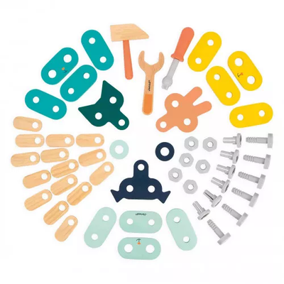 32 wooden pieces and 18 plastic elements (screws, nuts and inserts). Both the cat and the rabbit are made up of 16 pieces each, whilst the dog has 18 pieces. To promote independence whilst playing their animal construction game, children can use the 3 models provided: one per animal!