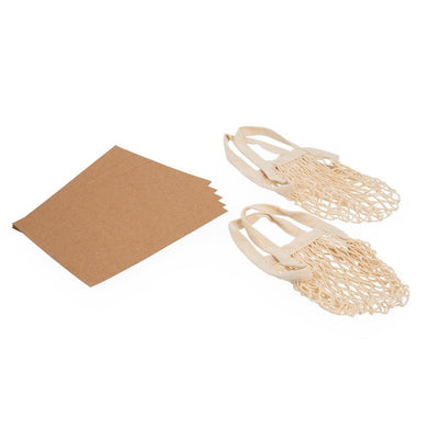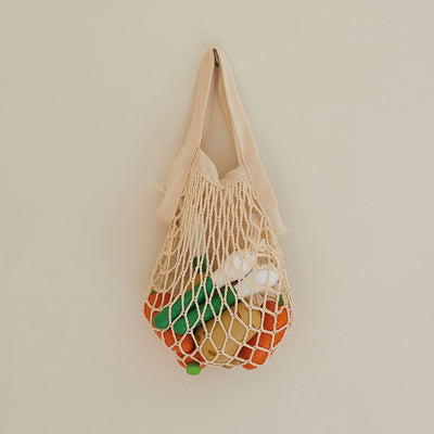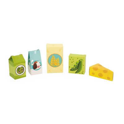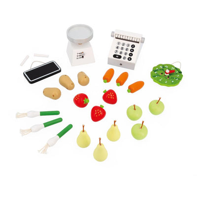 A total of 58 accessories complete this children's market: fresh fruits and vegetables (3 carrots, 3 potatoes, 3 leeks, 3 strawberries, 3 apples and 3 pears), 5 packaged goods (peas, flour, milk, apple juice and cheese), the essential equipment any good salesperson will need (1 clock, 1 scale, 1 till with 9 banknotes and 12 coins, 1 blackboard with 2 sticks of chalks), and the must-haves for a successful shopping trip 6 kraft paper bags for packing fruits and vegetables, and 2 fabric nets.