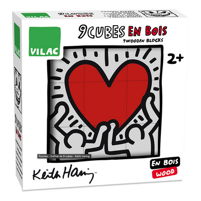 A box of 9 wooden cubes featuring 6 iconic drawings by Keith Haring.