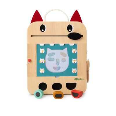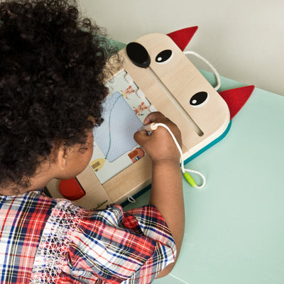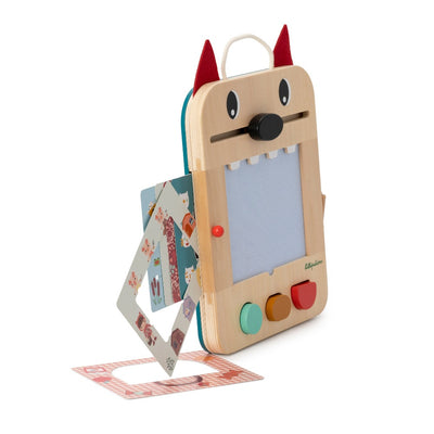Featuring a variety of colors, 3 stamps with geometric shapes, 6 game cards with 12 different challenges, and a trusty wooden pencil, this magical slate is perfect for engaging little hands and minds. And don't worry about making a mistake - Louis's nose doubles as an eraser for the drawing board. The designated slot on the back keeps the game cards safe and the pencil is attached by a string so it won't wander off.