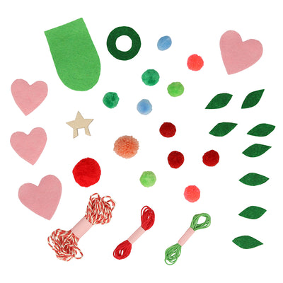 A wooden gingerbread style house, made with 6 pieces of wood. White felt roof pieces. Light green, dark green and pink felt pieces and 13 pompoms in 7 colours. Red and light green embroidery thread, red and white bakers twine, and a plastic embroidery needle. A wooden reindeer, made with 4 pieces of wood, A wooden tree and star, made with 3 pieces of wood. Simple instruction sheet and 22 clear stickers (as an option instead of knots for the thread/twine)