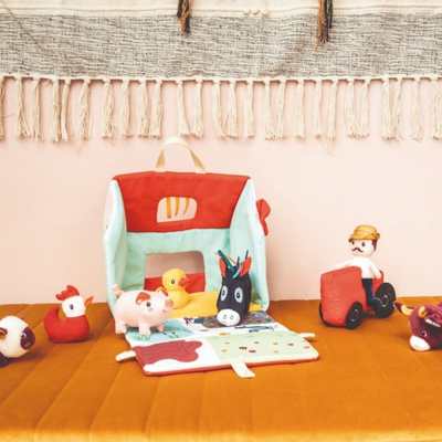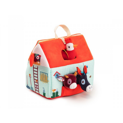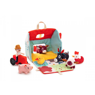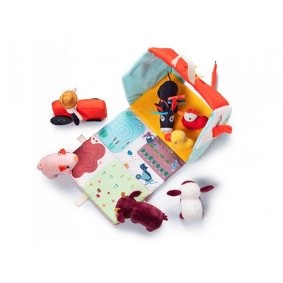 Farmhouse carrier, plush toys: farmer and tractor, duck, pig, sheep, donkey, cow, chicken.