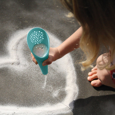 Use the shovel to scoop out sand and make tracks for rolling the ball or use the uniquely designed hole to write or make patterns with sand and water.