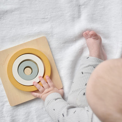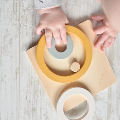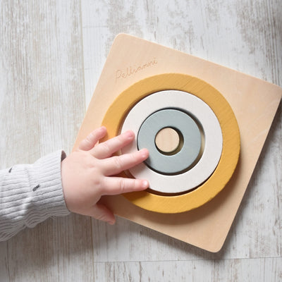 This round puzzle has three circles of different size and colour to placed on top of a smooth wooden base.
