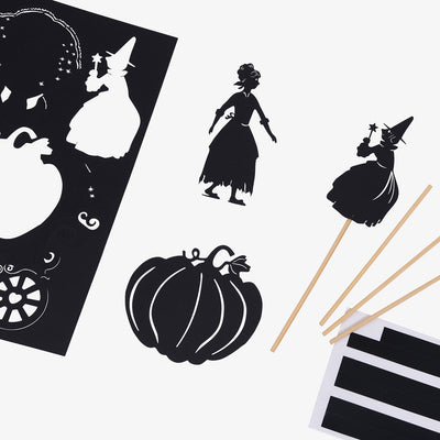Card theatre, forest backdrop, 12 lazercut shadow puppets to assemble and tell the story of Cinderella.