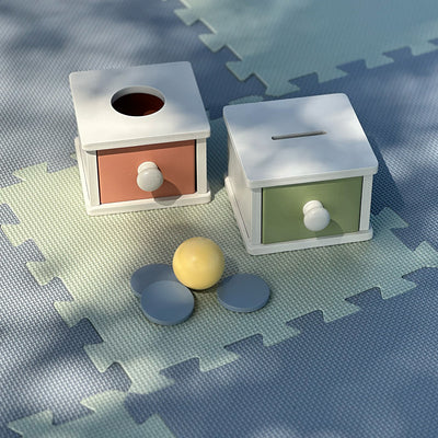 Let your child practice their fine motor skills and have fun at the same time with these two activity boxes. Both boxes have a drawer and a hole in the top. One box contains a round ball and the other contains five coins.