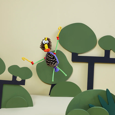 60-piece craft set for character creation, 2 eyes, 2 pairs of eyes, 4 mouths, 4 paws,6 tails, 4 cones, 20 joints, 10 sticks, 4 small flexible connectors, 4 long flexible connectors, Made from recycled plastics.