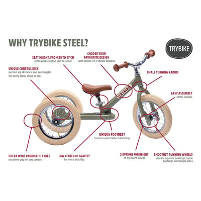 2-in-1 CONCEPT The Trybike Steel offers you 2 bikes in 1. The perfect bike for each step in your child’s early life. QUALITY The Trybike has been designed and developed in The Netherlands by Co&Co after many years of experience with balance bikes. We have applied our experience and selected the best materials, created the most durable construction and added the nicest details as well as a quality finish.