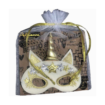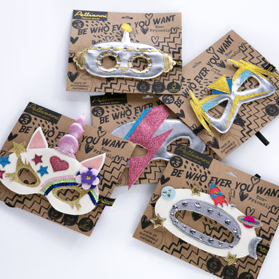 These lovely masks are made with Australian merino wool, natural and non-toxic. The glitter is safe for the environment, tested and so is the vegan leather. In the back there is a elastic band to make it fit nicely on the head and it comes with a ribbon to adjust the size.