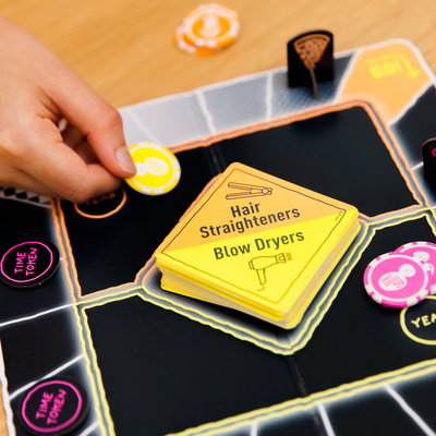 For example: Arnie or Helicopters, Frozen (the movie) or The Ice Bucket Challenge, and so on. Players place chips on which one they think is the oldest and double their stake if they get it right. Wins equal moves around the board.