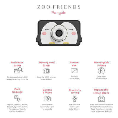Introducing the Penguin themed 32-megapixel digital kids’ camera and video recorder from The Zoofamily! Cute, compact, and lightweight, it’s perfectly made for little hands. Children can personalize their camera with stickers and explore 20+ fun filters and frames, sparking endless creativity.